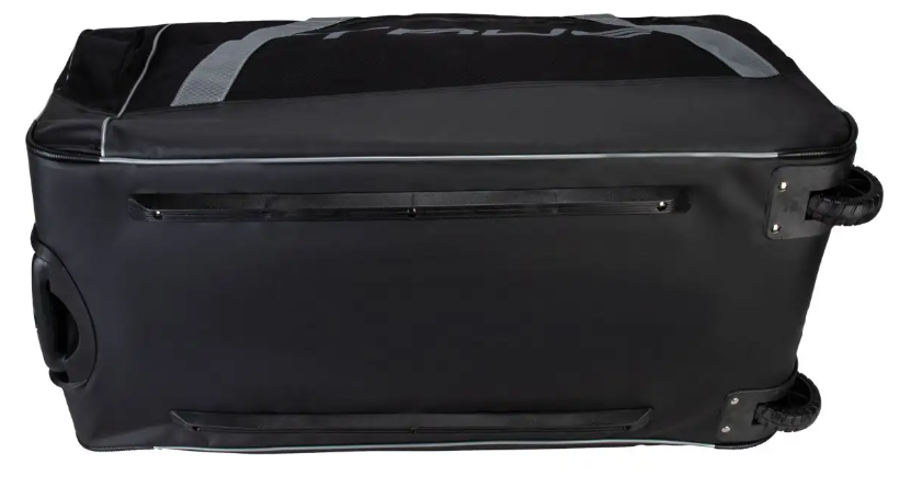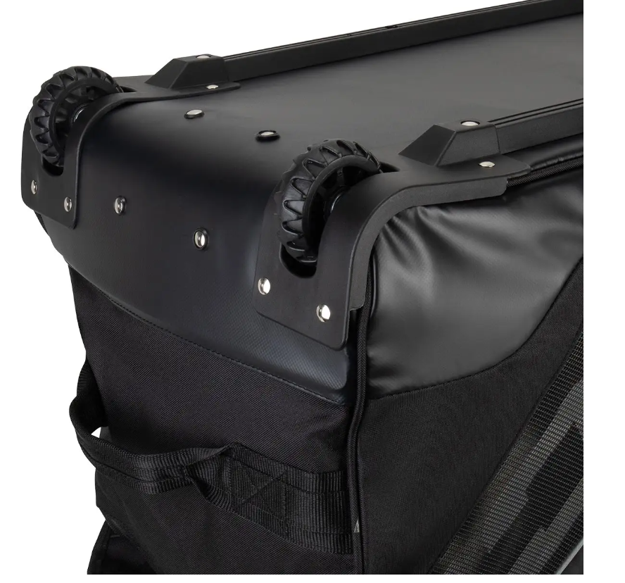 True Pro Wheeled Hockey Equipment Backpack: The True 4-Way Wheeled Hockey Equipment Bag features a durable ballistic nylon poly blend with abrasion, tear, and water resistance. It includes all-terrain wheels, a telescoping handle, TrueAir Flow breathable mesh skate pockets, oversized PU-coated zippers, and padded shoulder and side straps for easy carrying and organized gear access.