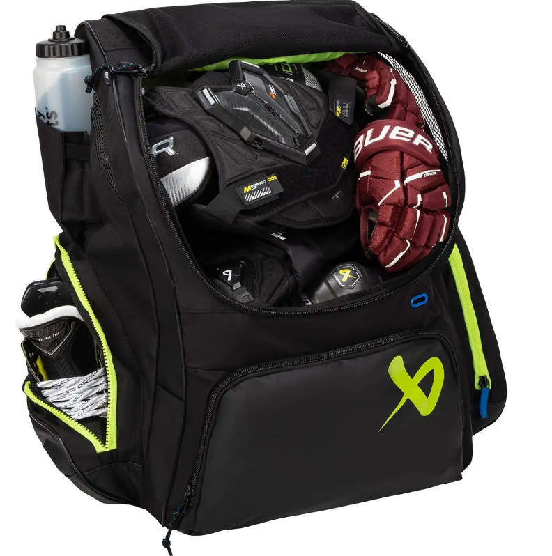 Bauer Outdoor Rink Bag (2025): The Bauer Outdoor Rink Bag is a top-loading, durable bag designed to carry all your rink-side essentials. It features external skate pockets, zippered accessory and cooler pockets, built-in organizers with laptop and tablet sleeves, a helmet clasp with bottle opener, and a 62L capacity (15" x 23" x 11").